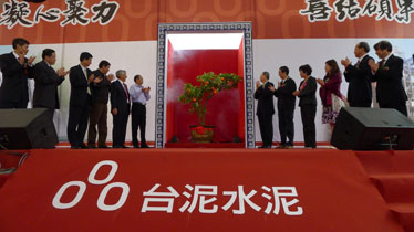 | 圖為:臺(tái)泥安順一期竣工慶典儀式上,眾領(lǐng)導(dǎo)嘉賓與臺(tái)泥董事長(zhǎng)辜成允等高層共同“喜迎碩果”。 |
