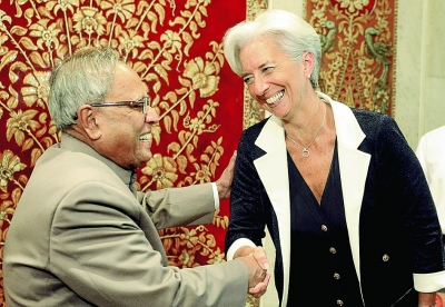 圖為拉加德(右)與印度財長穆克吉7日在新德里握手會談。