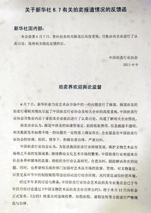 針對近期廣大網(wǎng)民、收藏愛好者和藝術界人士反映藝術品拍賣市場存在虛假鑒定、虛報成交額、聯(lián)手做局等不法行為的問題,中國拍賣行業(yè)協(xié)會9日召集“保利”“嘉德”“翰!薄翱飼r”等多家涉事拍賣企業(yè)就此進行溝通討論,認為報道中涉及“虛假鑒定”“拍前收取費用”“信息披露不透明”“相關數(shù)據(jù)發(fā)布標準不統(tǒng)一”等問題在一定程度上確實存在,中拍協(xié)將組織全行業(yè)開展自查自糾。 新華社“中國網(wǎng)事”欄目7日播發(fā)《網(wǎng)民發(fā)帖質(zhì)疑藝術品拍賣“天價”有貓膩