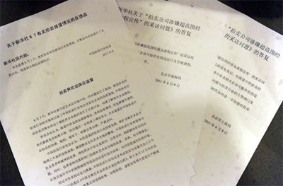 中拍協(xié)、北京市工商局、北京市地稅局對新華社之前相關報道的答復函(6月9日攝)。
