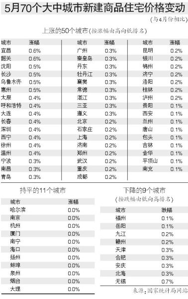 與去年同月相比,70個大中城市中,新建商品住宅價格下降的城市有3個,分別是杭州、三亞、南充;漲幅回落的城市有36個。5月份新建商品住宅價格同比(比上年同期)漲幅在5%以內(nèi)的城市有36個,比4月份增加了7個。