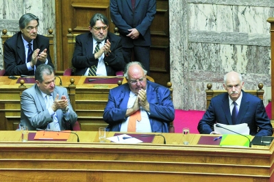 19日,希臘總理帕潘德里歐出席希臘議會(huì)舉行的針對(duì)新內(nèi)閣的信任投票,懇請(qǐng)國(guó)會(huì)就新的經(jīng)濟(jì)改革方案達(dá)成一致。