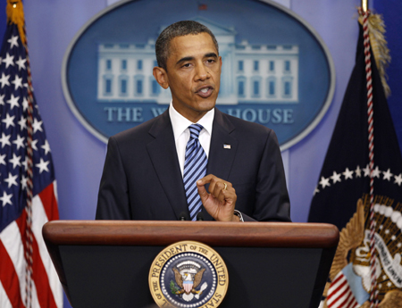 7月5日,在美國首都華盛頓,美國總統(tǒng)奧巴馬在白宮舉行的新聞發(fā)布會上講話。 奧巴馬5日表示,他將于7日與國會兩黨領(lǐng)導(dǎo)人在白宮繼續(xù)就削減赤字和提高公共債務(wù)上限議題舉行商討,他強調(diào)兩黨要通過合作來推進(jìn)談判進(jìn)程。
