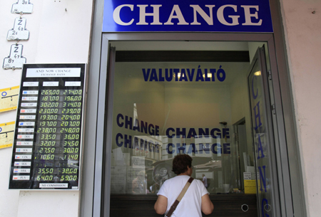 18日,一名顧客在布達(dá)佩斯外匯兌換處。當(dāng)日匈牙利福林兌瑞士法郎匯率跌至歷史新低,兌歐元跌至四個(gè)月來(lái)低點(diǎn),同日波蘭貨幣也大幅貶值。歐債危機(jī)持續(xù)令投資者更加青睞避險(xiǎn)資產(chǎn),從而沉重打壓了歐元區(qū)邊緣國(guó)家資產(chǎn)價(jià)格和貨幣幣值。