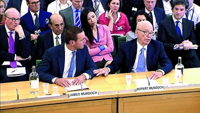 北京時(shí)間19日晚9點(diǎn)半,就電話竊聽丑聞,新聞集團(tuán)總裁默多克(右)和兒子詹姆斯接受英國議會(huì)下院“文化媒體和體育委員會(huì)”的聽證質(zhì)詢。聽證會(huì)一開始,詹姆斯就希望先進(jìn)行一次陳述,但被委員會(huì)主席約翰·廷戴爾拒絕了。默多克接過兒子的話說:“這是我人生中最卑微的一天!