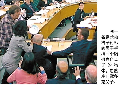 電視直播的畫面顯示,這位身穿長袖格子襯衫的男子,從老默多克的左側忽然沖向聽證席。坐在聽證席右側的小默多克首先發(fā)現(xiàn)不明襲擊者,他迅速躲過了襲擊并提醒父親小心。