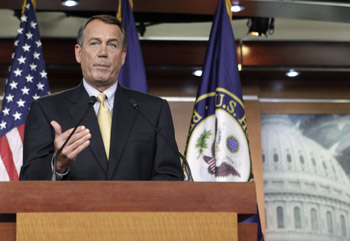 7月22日,在美國華盛頓國會山,美國眾議院議長約翰·博納就債務(wù)限額問題發(fā)表講話。 博納在稍后的記者會上批評奧巴馬,稱后者要求將未來10年額外增稅4000億美元,且拒絕增加社保開支削減規(guī)模,要為這輪談判告吹負(fù)責(zé)。新華社/路透 |