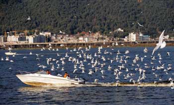 滇池沿湖生態(tài)修復(fù)工程初見成效。一群紅嘴鷗在昆明滇池草海上自由飛翔。記者