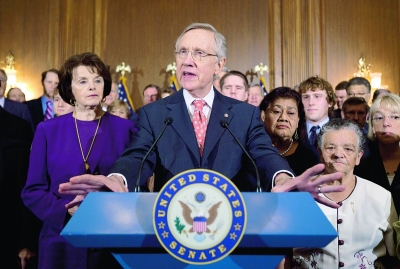 圖為7月30日,在美國(guó)首都華盛頓的國(guó)會(huì)大廈,參議院民主黨領(lǐng)袖里德(前)出席新聞發(fā)布會(huì)。