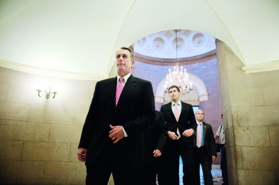 圖為8月1日,在美國首都華盛頓,美國眾議院議長博納(左)步入眾議院大廳投票。