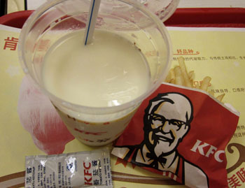 在肯德基,一杯豆?jié){粉沖調(diào)的熱豆?jié){每杯6.5元、冰豆?jié){每杯7.5元(肯德基宅急送價(jià)格),而有人在網(wǎng)站搜索“肯德基豆?jié){粉”,發(fā)現(xiàn)一袋號(hào)稱(chēng)專(zhuān)供肯德基的480克的豆?jié){粉售價(jià)僅為15元。而按豆?jié){粉兌水比例計(jì)算,每杯豆?jié){成本約為0.7元。
