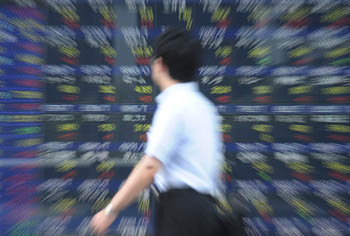 8月15日,在日本首都東京,一名行人從股市信息顯示屏前走過(guò)。