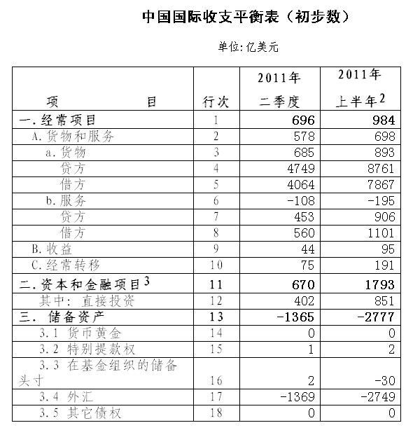 日前,國家外匯管理局公布2011年二季度及上半年我國國際收支平衡表初步數(shù)據(jù)。