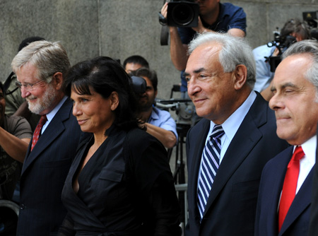 8月23日,國際貨幣基金組織(IMF)前總裁多米尼克·斯特勞斯-卡恩(右二)和妻子安妮·辛克萊(右三)在法官宣布撤訴后走出紐約州高等法院。 當日,紐約州高等法院法官邁克爾·奧拜作出裁決,正式撤銷對卡恩的刑事指控。