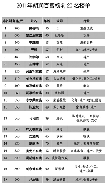 9月7日,胡潤(rùn)研究院發(fā)布《2011雅居樂海南清水灣胡潤(rùn)百富榜》的前50名,這是胡潤(rùn)研究院自1999年以來(lái)第十三年發(fā)布“胡潤(rùn)百富榜”,從這些富豪的排名的起起落落中,自2008年金融危機(jī)以來(lái)中國(guó)各行業(yè)的興衰起伏可窺見一斑。