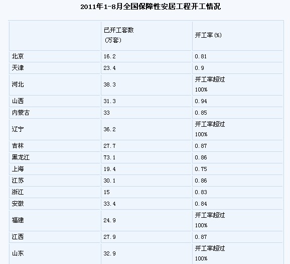 今年1-8月份,全國(guó)城鎮(zhèn)保障性住房和棚戶區(qū)改造住房已實(shí)物開工868 萬(wàn)套,開工率86%(不含西藏自治區(qū))。各省、自治區(qū)、直轄市和新疆生產(chǎn)建設(shè)兵團(tuán)建設(shè)進(jìn)度情況見下表。另外,1-8月份各地區(qū)還新增發(fā)放廉租住房租賃補(bǔ)貼18萬(wàn)戶。
