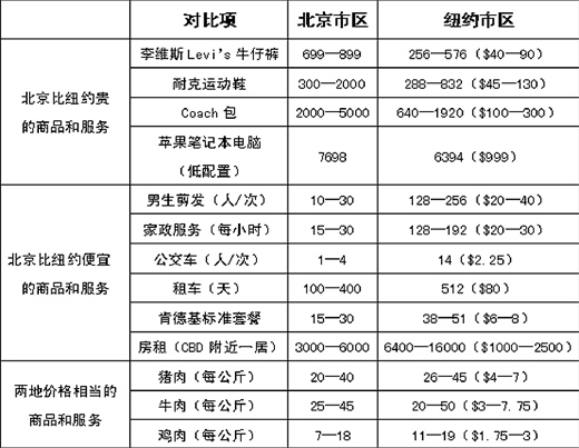 但專家分析認為,由于北京與紐約兩大城市在經(jīng)濟結(jié)構(gòu)、收入水平等方面存在巨大差距,導(dǎo)致價格構(gòu)成存在很大差異,簡單的價格對比很難有說服力,而且容易造成誤解。 首先,中美稅制結(jié)構(gòu)和征稅方式差異較大,導(dǎo)致商場標價和消費者最終實際給付的費用,可能存在較大差距。比如美國商場的標價是裸價,而我國的標價是含稅價格。仍以Levi"s牌牛仔褲為例。經(jīng)典款501號在中國的官方網(wǎng)站售價是799元人民幣,在美國官方網(wǎng)站標價為64美元—98美元,且需要支付3%—9%的消費稅。也就是說,在紐約商場看似比北京便宜很多的這款牛仔褲,其實和北京的市價差距并不很大。 其次,拿美國的打折價與國內(nèi)的正價相比并不合理。為什么能在美國買到超低價的Levi"s牛仔褲呢?“我在奧特萊斯賣場買到過21美元的Levi"s。因為我比較瘦小,尺碼老外都穿不了,最后處理甩賣當然便宜!痹诿绹魧W的學生小楊說。因此,拿美國的折扣價格和中國的正價相比,價差當然就擴大了。 最后,我們比較的未必是同一事物,大家很難選定完全可比的標的物。以年輕人支出最大的居住成本為例,在北京國貿(mào)附近,環(huán)境比較好的小區(qū),一居的租金在5000元/月左右,而在郊區(qū)一兩千元也能租到一居室。如果拿北京和紐約不同地段的房租相比,顯然并不科學。即便在地段相當?shù)膮^(qū)域,也很難確定房子的房齡、裝修、交通、配套設(shè)施等一系列條件是否類似。 專家提醒,在中美價格的比較中,人們最經(jīng)常比較的是消費品,如服裝、箱包、電子產(chǎn)品等。這些消費品中,大部分在國內(nèi)的價格比在美國的價格的確高一些。但卻很少有人比較教育、圖書、音像、人工服務(wù)等,而這些產(chǎn)品和服務(wù)美國要比中國貴很多。不少中國游客雖然在境外大量購物,但不在美國長期生活,所以很難全面感受美國物價水平。