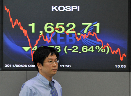 9月26日,在韓國首都首爾的韓國交換銀行,一名交易員走過顯示韓國基準股票指數(shù)的電子顯示屏。 當天,受投資者對歐元區(qū)債務危機前景擔憂加劇等因素影響,亞太地區(qū)主要股市全線下挫。韓國首爾股市綜合指數(shù)下跌44.73點,收于1652.71點,跌幅為2.64%。