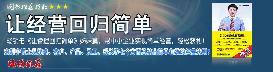在《讓經營回歸簡單》一書中,宋新宇博士站在成長型企業(yè)經營者的角度,根據(jù)多年的實踐和研究,從“老板自身”、“戰(zhàn)略”、“客戶”、“產品”、