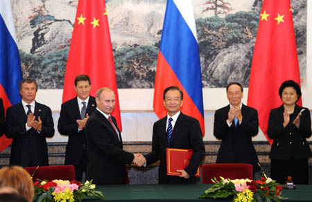 10月11日,中國國務院總理溫家寶在北京人民大會堂與來訪的俄羅斯總理普京舉行會晤。雙方將根據(jù)兩國關系未來10年發(fā)展戰(zhàn)略規(guī)劃,創(chuàng)新合作方式,拓展合作領域,改善中俄貿易結構和貿易環(huán)境,加大對雙向投資的政策、資金支持,鼓勵擴大投資規(guī)模。同時繼續(xù)推進石油、天然氣、核能、煤炭、電力、水利、環(huán)保和高科技等領域的合作。 圖為溫家寶和普京在會晤后共同出席的簽字儀式上握手。