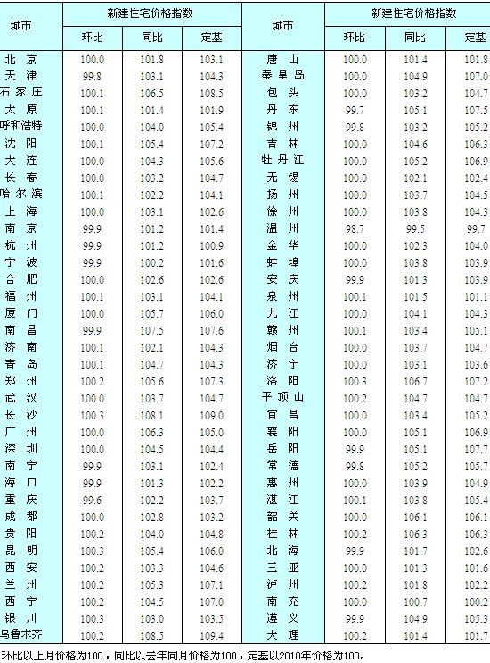 3、2011年9月份,68個城市的新建住宅價格指數(shù)根據(jù)網(wǎng)簽數(shù)據(jù)計算,其他2個城市根據(jù)統(tǒng)計系統(tǒng)房地產(chǎn)開發(fā)統(tǒng)計報表中各個項目的分類銷售面積和金額數(shù)據(jù)計算。68個網(wǎng)簽數(shù)據(jù)城市分別是:北京、天津、石家莊、太原、呼和浩特、沈陽、大連、長春、哈爾濱、上海、南京、杭州、寧波、合肥、福州、廈門、南昌、濟(jì)南、青島、鄭州、武漢、長沙、廣州、深圳、南寧、海口、重慶、成都、貴陽、昆明、西安、蘭州、西寧、銀川、烏魯木齊、唐山、秦皇島、包頭、丹東、吉林、牡丹江、無錫、揚(yáng)州、徐州、溫州、金華、蚌埠、安慶、泉州、九江、贛州、煙臺、濟(jì)寧、洛陽、平頂山、宜昌、襄陽、岳陽、常德、惠州、湛江、韶關(guān)、桂林、北海、三亞、瀘州、南充、大理。9月份新增加的城市是唐山、贛州、大理。