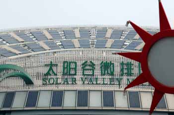 當你走近中國太陽谷時,首先遠遠映入眼簾的就是高大的太陽能圖騰矩陣。上頭是風電裝置和太陽能電池板,中間是太陽能LED顯示時間,而基座上則是世界各地有關太陽能文化的浮雕,極具世界文化風采。