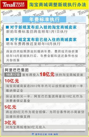 當(dāng)天淘寶商城宣布升級(jí)商家管理體系,同時(shí)公布了2012年度商家招商續(xù)簽及相關(guān)規(guī)則。規(guī)則顯示,商鋪技術(shù)服務(wù)年費(fèi)將從6000元提至3萬元到6萬元,商鋪的違約保證金數(shù)額則從1萬元漲至5萬元到15萬元不等。與此同時(shí)還規(guī)定,費(fèi)用須在今年12月26日前一次性繳清。