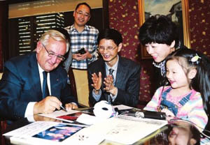 一個(gè)成都家庭2個(gè)月前通過E-mail的誠(chéng)摯邀請(qǐng),得到了法國(guó)參議院副議長(zhǎng)、前總理拉法蘭的熱情回應(yīng)。昨晚,率領(lǐng)法國(guó)企業(yè)家和青年學(xué)生代表團(tuán)對(duì)中國(guó)進(jìn)行為期一周考察訪問的拉法蘭出席完相關(guān)活動(dòng)之后,就在成都會(huì)見了這個(gè)“三口之家”。不僅現(xiàn)場(chǎng)繪畫題字,還與發(fā)出邀請(qǐng)的成都大學(xué)副校長(zhǎng)張其佐拉起了家常。華西都市報(bào)記者作為特邀嘉賓,獨(dú)家全程見證了整個(gè)會(huì)見。