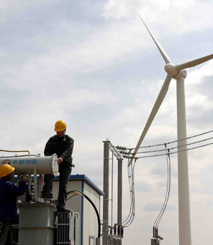 技術(shù)人員正在河北圍場滿族蒙古族自治縣紅松洼風(fēng)電場安裝風(fēng)電設(shè)備。 |
