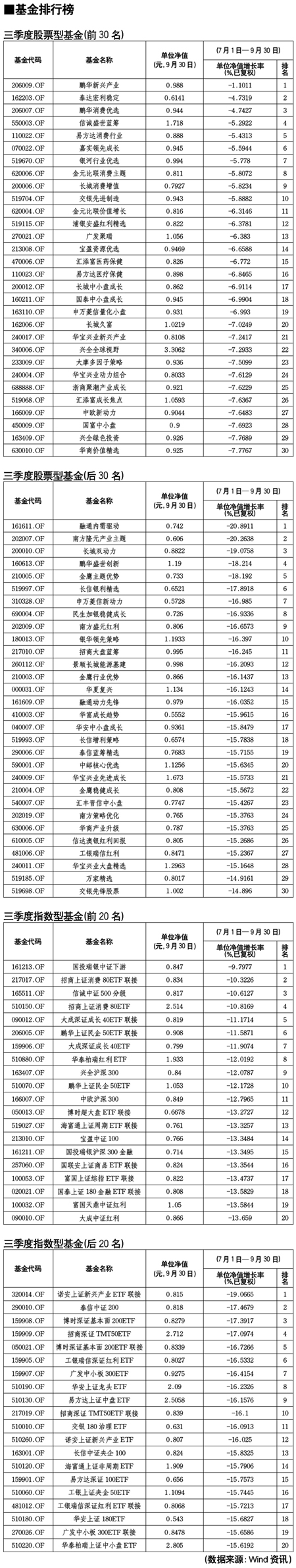 三季度股票型基金排行榜