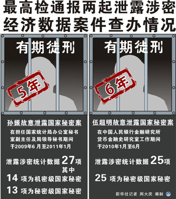 據(jù)李忠誠介紹,孫振、伍超明等人泄露的宏觀數(shù)據(jù)主要包括幾個(gè)方面:工業(yè)增加值、城鎮(zhèn)固定資產(chǎn)投資同比增長、國民生產(chǎn)總值(GDP)、全民消費(fèi)價(jià)格指數(shù)(CPI),工業(yè)產(chǎn)品出廠價(jià)格指數(shù)(PPI)、消費(fèi)品零售總額、人民幣貸款增加、廣義貨幣同比增長M2、狹義貨幣同比增長(M1)等九種。經(jīng)保密行政管理部門鑒定,部分?jǐn)?shù)據(jù)在國家正式公布前,屬于機(jī)密級國家秘密,部分?jǐn)?shù)據(jù)在國家正式公布前屬于秘密級國家秘密。 李忠誠介紹,孫振在擔(dān)任國家統(tǒng)計(jì)局辦公室秘書室副主任及局領(lǐng)導(dǎo)秘書期間,于2009年6月至2011年1月,違反國家保密法規(guī)定,先后多次將國家統(tǒng)計(jì)局尚未對外公布的涉密統(tǒng)計(jì)數(shù)據(jù)共計(jì)27項(xiàng),泄露給證券行業(yè)從業(yè)人員付某、張某等人。經(jīng)鑒定,這27項(xiàng)被泄露的統(tǒng)計(jì)數(shù)據(jù)中有14項(xiàng)為機(jī)密級國家秘密,13項(xiàng)為秘密級國家秘密。近日,北京市西城區(qū)人民法院以故意泄露國家秘密罪依法判處被告人孫振有期徒刑五年。 伍超明在中國人民銀行金融研究所貨幣金融史研究室工作期間,于2010年1月至6月,違反國家保密法規(guī)定,將其在價(jià)格監(jiān)測分析行外專家咨詢會上合法獲悉的、尚未正式公布的涉密統(tǒng)計(jì)數(shù)據(jù)25項(xiàng),向證券行業(yè)從業(yè)人員魏某、劉某、伍某等15人故意泄露224次,經(jīng)鑒定,上述被泄露的25項(xiàng)統(tǒng)計(jì)數(shù)據(jù)均為國家秘密級秘密。近日,北京市西城區(qū)人民法院以故意泄露國家秘密罪依法判處被告人伍超明有期徒刑六年。兩被告均未提起上訴。 據(jù)介紹,重要經(jīng)濟(jì)數(shù)據(jù)泄露以后的危害主要表現(xiàn)在三個(gè)方面:一、政府的公信力受到了影響;二、經(jīng)濟(jì)秩序遭到了破壞;三、給經(jīng)濟(jì)運(yùn)行帶來危害。每一次經(jīng)濟(jì)數(shù)據(jù)泄露以后,股市發(fā)生異常波動(dòng),異常波動(dòng)背后就有一些不公平的現(xiàn)象出現(xiàn),所以維護(hù)及確保經(jīng)濟(jì)數(shù)據(jù)安全是經(jīng)濟(jì)部門和保密部門一項(xiàng)重要的職責(zé)。