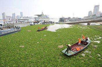 圖為8月29日武漢水上管理處清漂隊(duì)員在長江武漢段打撈水葫蘆。當(dāng)時(shí),密密麻麻的水葫蘆綿延達(dá)數(shù)十公里。新華社發(fā)(葉火生/攝) |