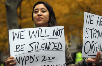 在美國紐約祖科蒂公園外,一名“占領(lǐng)華爾街”活動抗議者手持寫有“我們不會沉默”字樣的標語。新華社/法新 |