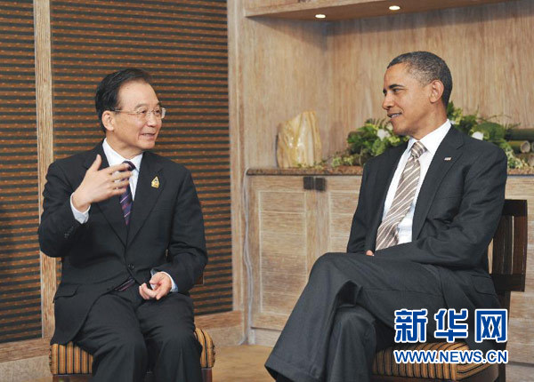 國務(wù)院總理溫家寶19日在印尼巴厘島出席東亞領(lǐng)導(dǎo)人系列會議期間會見美國總統(tǒng)奧巴馬。