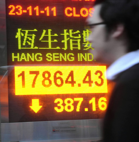 受隔夜美國(guó)股市下跌等因素影響,亞太地區(qū)主要股市23日多數(shù)下跌。當(dāng)日,香港恒生指數(shù)下跌387.16點(diǎn),收?qǐng)?bào)17864.43點(diǎn),跌幅為2.12%。 11月23日,一名市民從香港灣仔一家銀行的恒生指數(shù)電子顯示屏前走過(guò)。