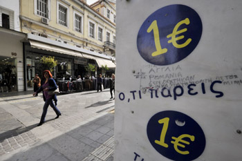 在希臘雅典街頭,一名婦女走過一家“一歐元”商店。新華社發(fā) |