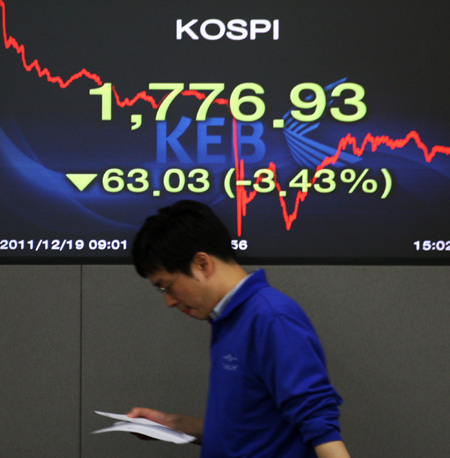 12月19日,在韓國首爾外匯銀行交易室內(nèi),交易員走過大屏幕。 當日,韓國股市大跌,收盤時,韓國首爾股市綜合指數(shù)(KOSPI)下跌63.03點,報收1776.93點,跌幅達3.43%。