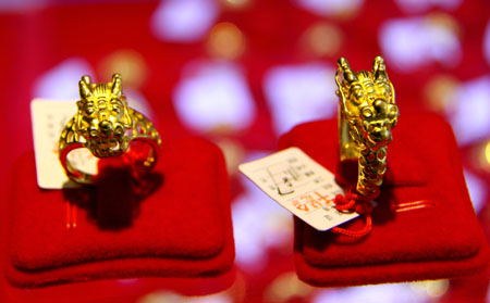 受到伊朗地區(qū)局勢(shì)緊張刺激,市場(chǎng)避險(xiǎn)情緒高漲,再加上美元走弱的支撐,紐約黃金期價(jià)1月3日上漲2.2%,再次收于每盎司1600美元之上。 圖為1月4日一珠寶城金店陳列的金龍黃金戒指。