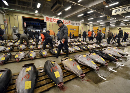 1月5日,在日本東京筑地市場(chǎng),魚(yú)販在新年首個(gè)開(kāi)市日整理待售的金槍魚(yú)。在東京筑地市場(chǎng)一年一度的新年“金槍魚(yú)王”拍賣(mài)活動(dòng)中,一條重269公斤的藍(lán)鰭金槍魚(yú)拍出5649萬(wàn)日元(約合464萬(wàn)元人民幣)的創(chuàng)紀(jì)錄高價(jià),相當(dāng)于每公斤21萬(wàn)日元(約合1.7萬(wàn)元人民幣)。