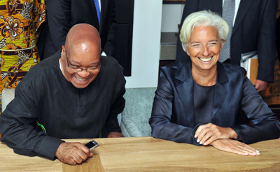 國際貨幣基金組織(IMF)總裁拉加德(右)7日與南非總統(tǒng)祖馬出席南非非洲人國民大會成立100周年紀念慶祝活動。拉加德稱贊了南非近年來出色的經(jīng)濟表現(xiàn),但警告說“歐洲債務(wù)危機對非洲最大經(jīng)濟體帶來的風險”。