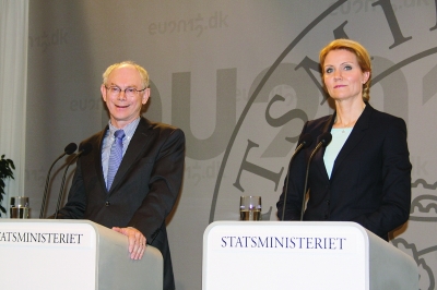 當(dāng)?shù)貢r(shí)間1月9日,歐洲理事會(huì)主席范龍佩(左)與丹麥?zhǔn)紫嗪绽铡ね袑?施密特在哥本哈根舉行會(huì)晤后共同會(huì)見記者。