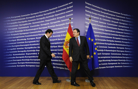 圖為2012年1月30日,在布魯塞爾歐盟總部,西班牙首相拉霍伊和歐盟委員會主席巴羅佐(右)與媒體見面。 據(jù)法新社報道,歐洲領(lǐng)導(dǎo)人打算就歐債問題達成一項協(xié)議,但在希臘債務(wù)問題上,他們將再次產(chǎn)生分歧。 另據(jù)法國《費加羅報》30日報道,希臘問題令歐盟峰會頭疼?梢灶A(yù)見,本次歐盟峰會不會產(chǎn)生什么重大的突破,能夠在希臘問題上有一些推進就已經(jīng)很不錯了。