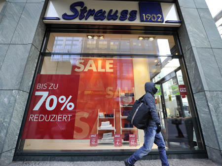 1月30日,在德國柏林商業(yè)街弗里德里希大街上,顧客從張貼有打折海報的商鋪前走過。