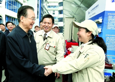 2月3日至4日,國務(wù)院總理溫家寶到廣東省走訪企業(yè)、村莊。這是2月4日,溫家寶考察白云電氣集團公司時與工人親切交談。
