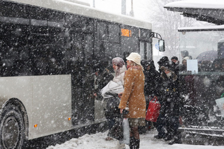 圖為塞爾維亞貝爾格萊德民眾在大雪中等候公共汽車。