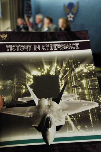 在美國首都華盛頓國家記者俱樂部舉行的一次新聞發(fā)布會上,美國空軍網(wǎng)絡(luò)戰(zhàn)爭司令部的高級官員向新聞界闡述了網(wǎng)絡(luò)戰(zhàn)爭的理念。這是在現(xiàn)場拍攝的美國空軍網(wǎng)絡(luò)戰(zhàn)爭司令部的宣傳冊。記者
