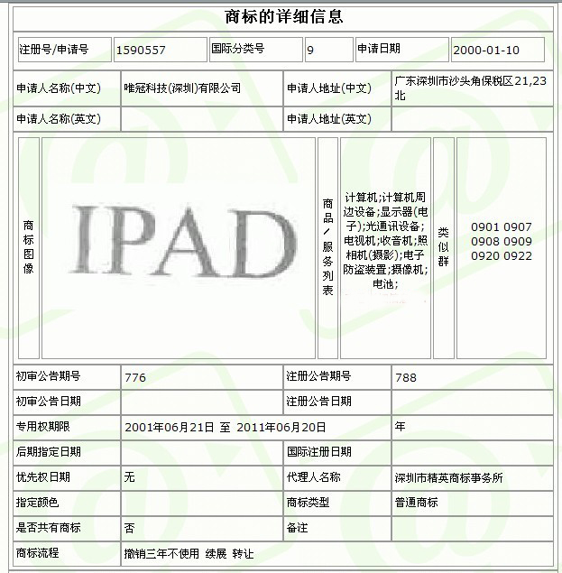 內(nèi)地注冊信息顯示 深圳唯冠在2000年就擁有了iPad注冊商標