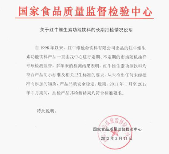 國(guó)家食品質(zhì)量監(jiān)督檢驗(yàn)中心《關(guān)于紅牛維生素功能飲料的長(zhǎng)期抽檢情況說(shuō)明》