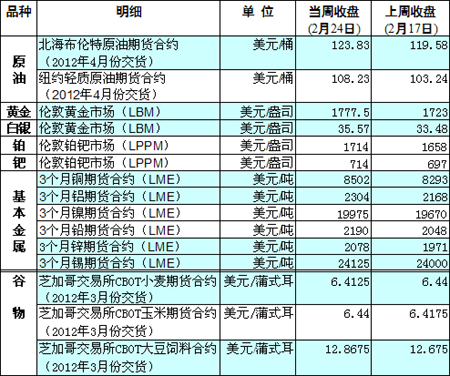 國際大宗商品期貨價格明細(xì)表[2012-02-27]