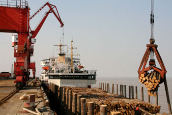 貨船在鹽城大豐港口卸載木材。新華社發(fā) |